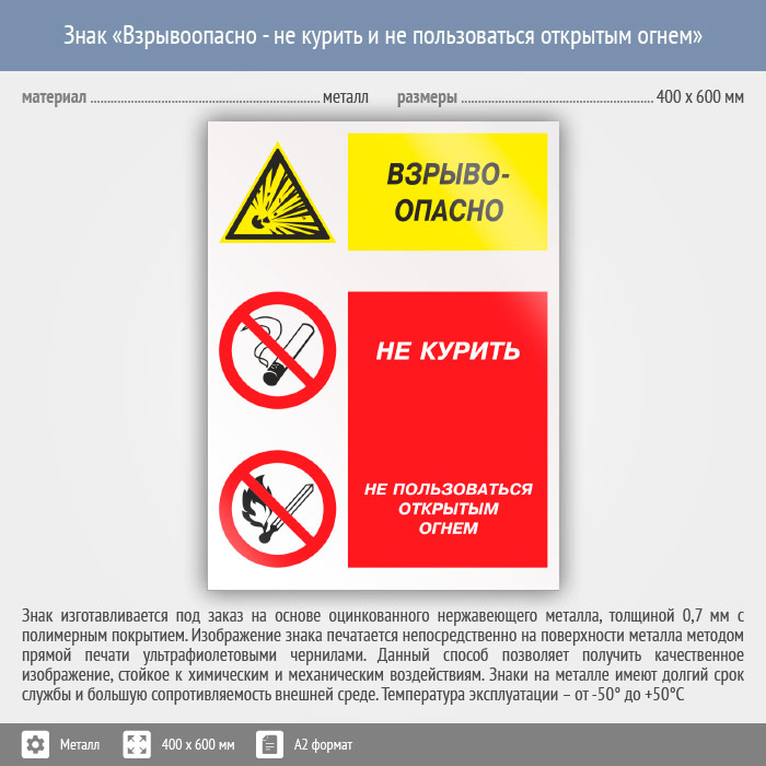 Знак «Взрывоопасно - не курить и не пользоваться открытым огнем», КЗ-08 (металл, 400х600 мм) в Яхроме купить