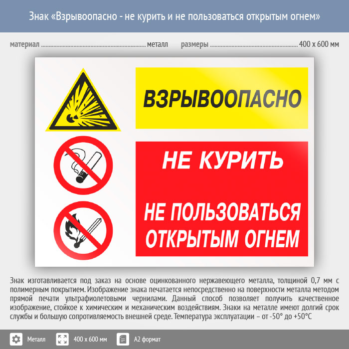 Знак «Взрывоопасно - не курить и не пользоваться открытым огнем», КЗ-09 (металл, 600х400 мм) в Яхроме купить