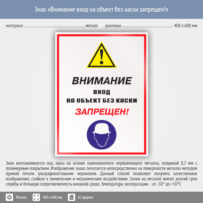 Знак «Внимание вход на объект без каски запрещен!», КЗ-13 (металл, 400х600 мм) в Яхроме купить