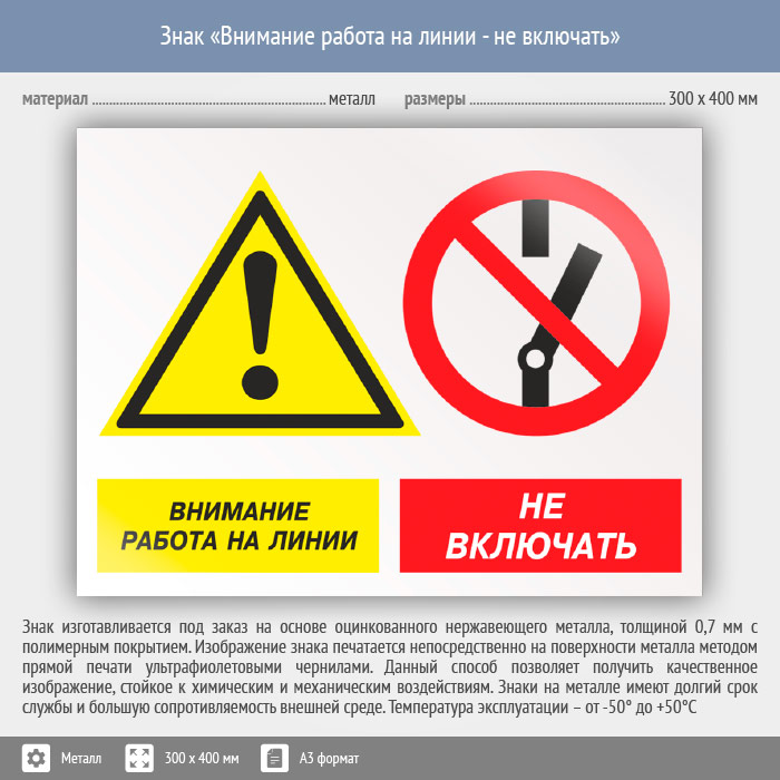 Знак «Внимание работа на линии - не включать», КЗ-16 (металл, 400х300 мм) в Яхроме купить