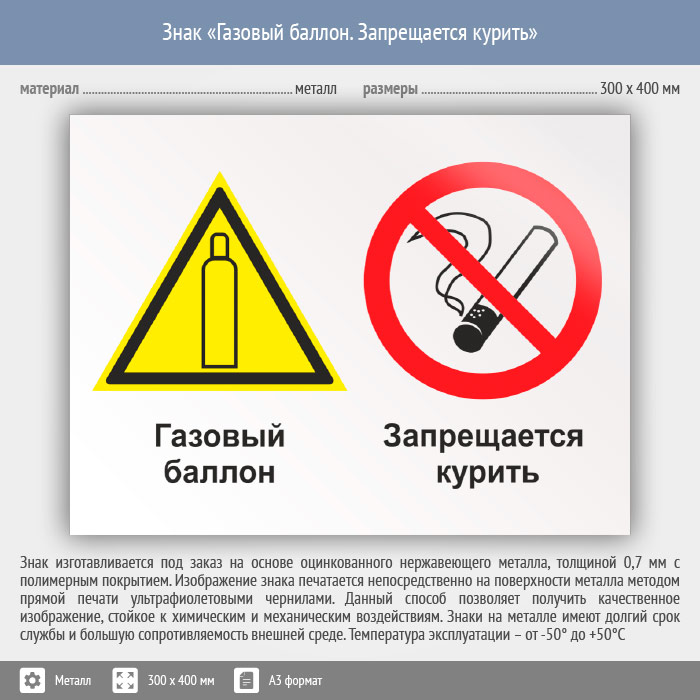 Знак «Газовый баллон. Запрещается курить», КЗ-18 (металл, 400х300 мм) в Яхроме купить