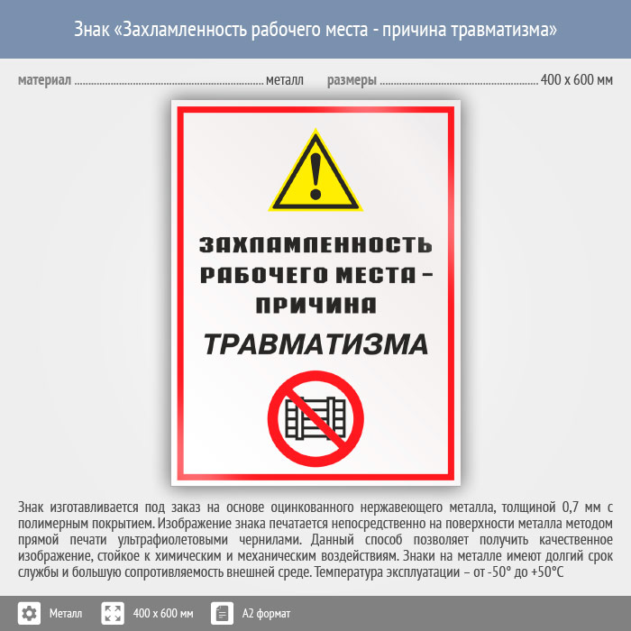 Знак «Захламленность рабочего места - причина травматизма», КЗ-21 (металл, 400х600 мм) в Яхроме купить