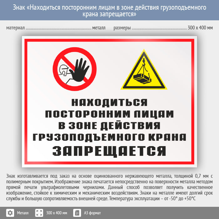 Знак «Находиться посторонним лицам в зоне действия грузоподъемного крана запрещается», КЗ-23 (металл, 400х300 мм) в Яхроме купить