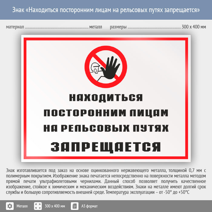Знак «Находиться посторонним лицам на рельсовых путях запрещается», КЗ-25 (металл, 400х300 мм) в Яхроме купить