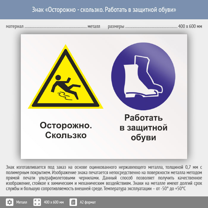 Знак «Осторожно - скользко. Работать в защитной обуви», КЗ-57 (металл, 600х400 мм) в Яхроме купить