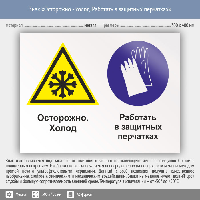 Знак «Осторожно - холод. Работать в защитных перчатках», КЗ-59 (металл, 400х300 мм) в Яхроме купить