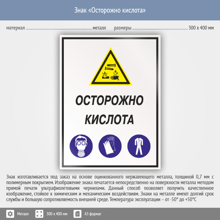 Знак «Осторожно кислота», КЗ-61 (металл, 300х400 мм) в Яхроме купить