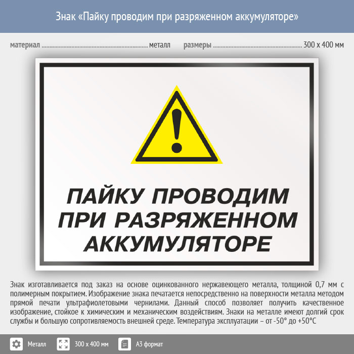 Знак «Пайку проводим при разряженном аккумуляторе», КЗ-62 (металл, 400х300 мм) в Яхроме купить