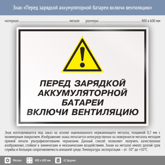 Знак «Перед зарядкой аккумуляторной батареи включи вентиляцию», КЗ-63 (металл, 600х400 мм) в Яхроме купить
