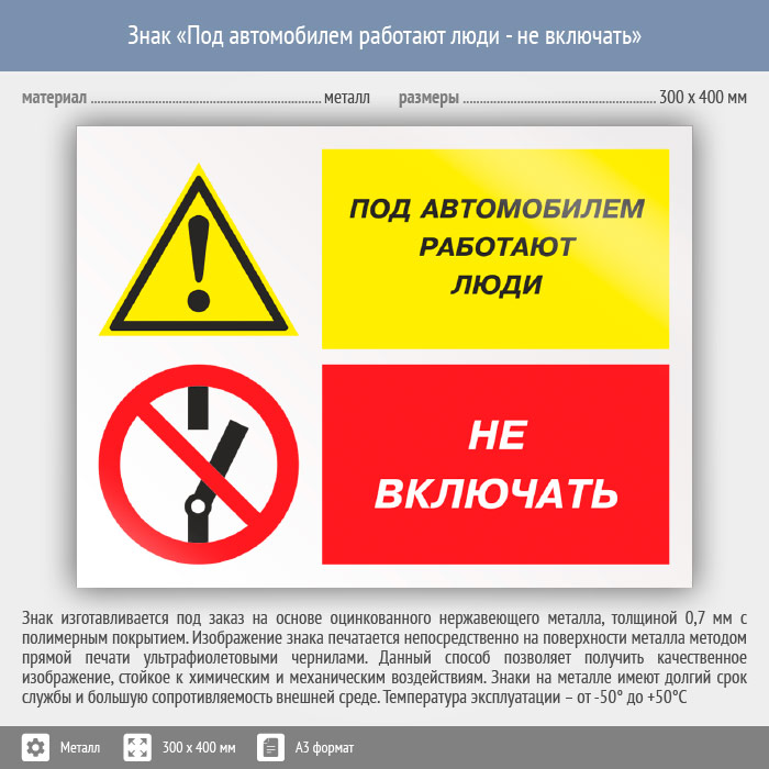 Знак «Под автомобилем работают люди - не включать», КЗ-65 (металл, 400х300 мм) в Яхроме купить