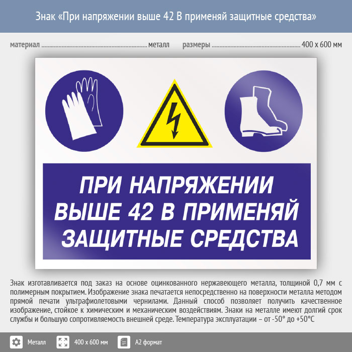 Знак «При напряжении выше 42 В применяй защитные средства», КЗ-72 (металл, 600х400 мм) в Яхроме купить