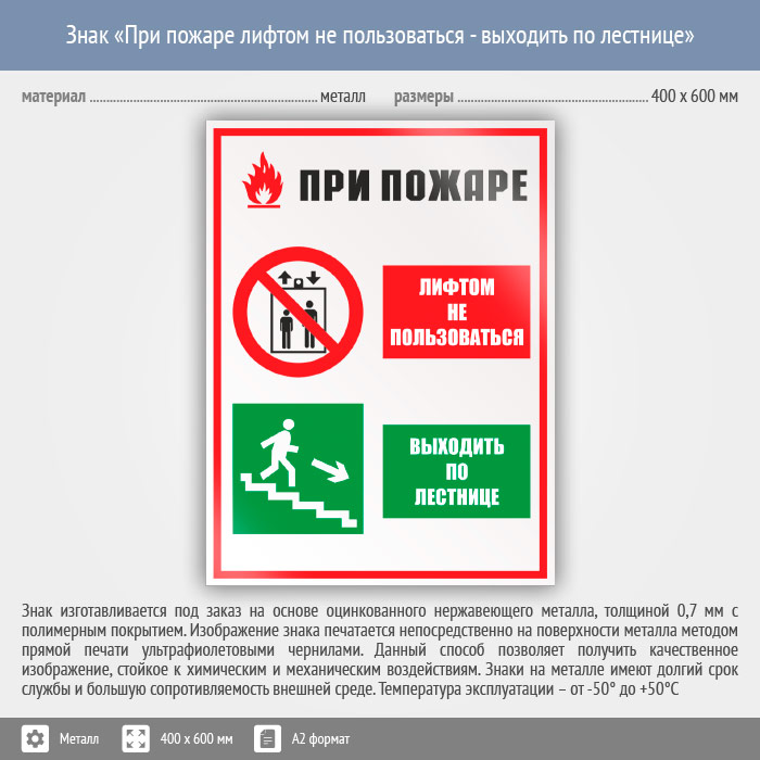 Знак «При пожаре лифтом не пользоваться - выходить по лестнице», КЗ-73 (металл, 400х600 мм) в Яхроме купить