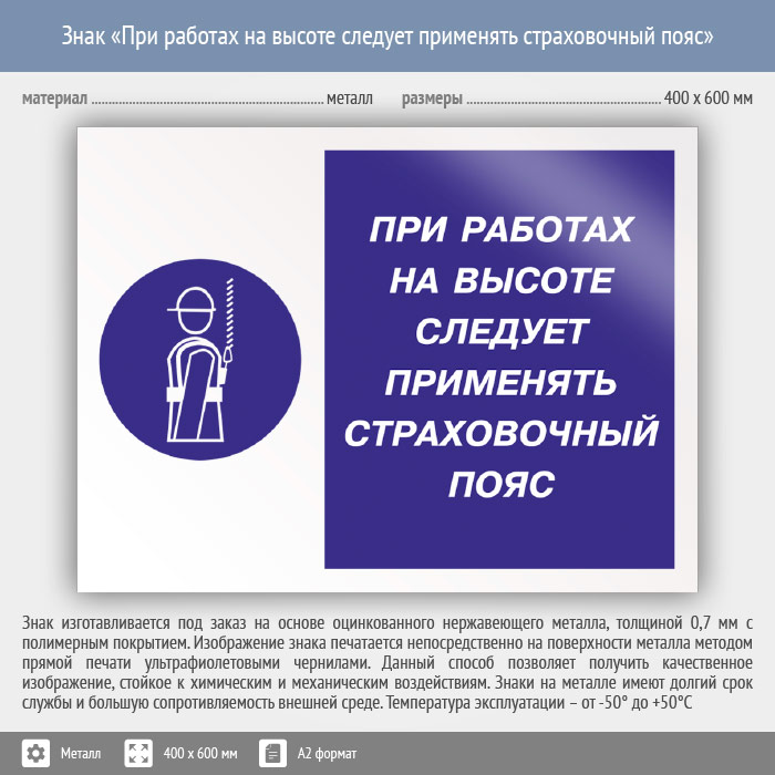 Знак «При работах на высоте следует применять страховочный пояс», КЗ-75 (металл, 600х400 мм) в Яхроме купить