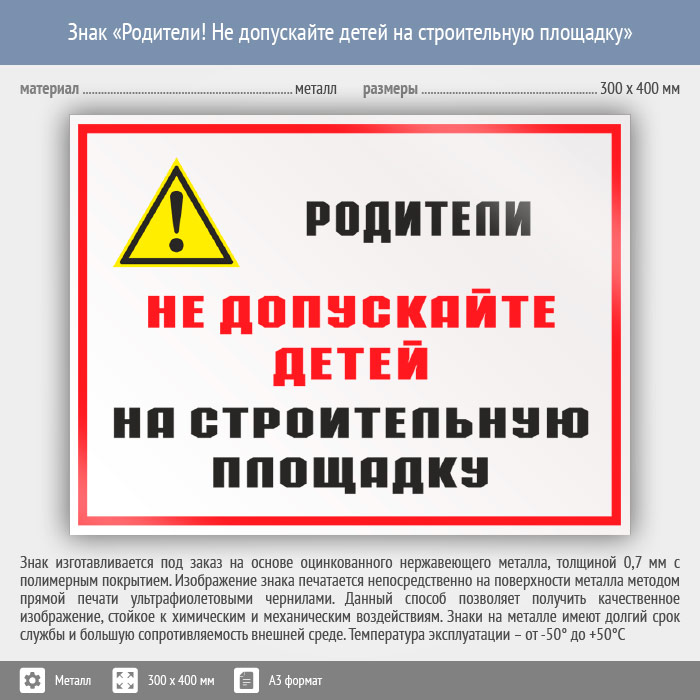 Знак «Родители! Не допускайте детей на строительную площадку», КЗ-84 (металл, 400х300 мм) в Яхроме купить