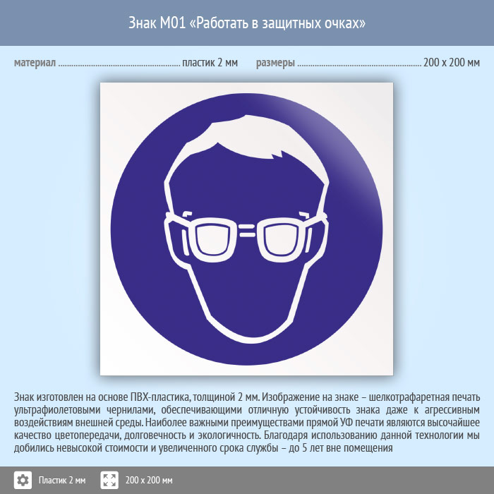 Знак M01 «Работать в защитных очках» (пластик, 200х200 мм) в Яхроме купить