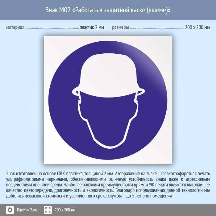 Знак M02 «Работать в защитной каске (шлеме)» (пластик, 200х200 мм) в Яхроме купить