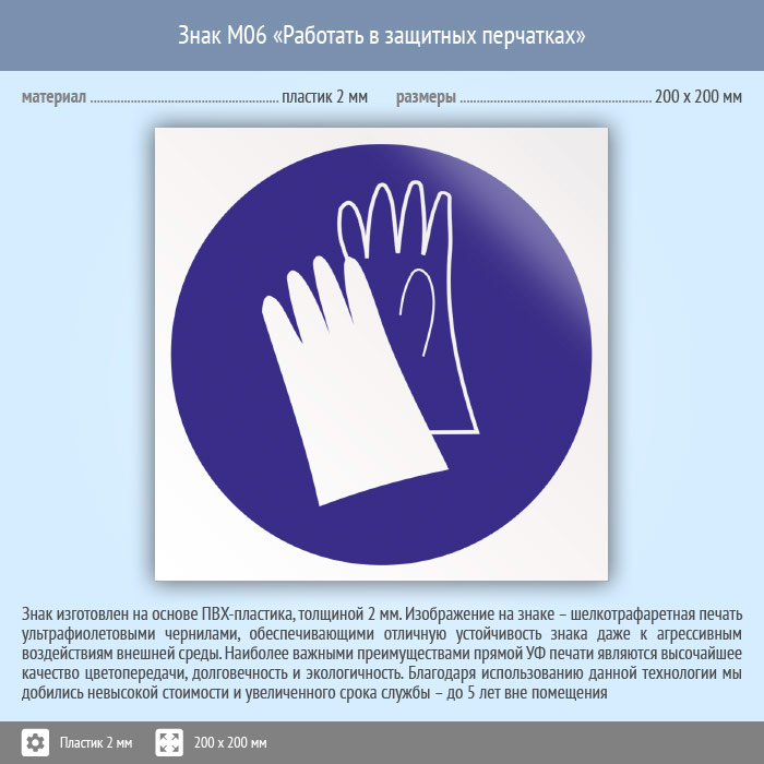 Знак M06 «Работать в защитных перчатках» (пластик, 200х200 мм) в Яхроме купить