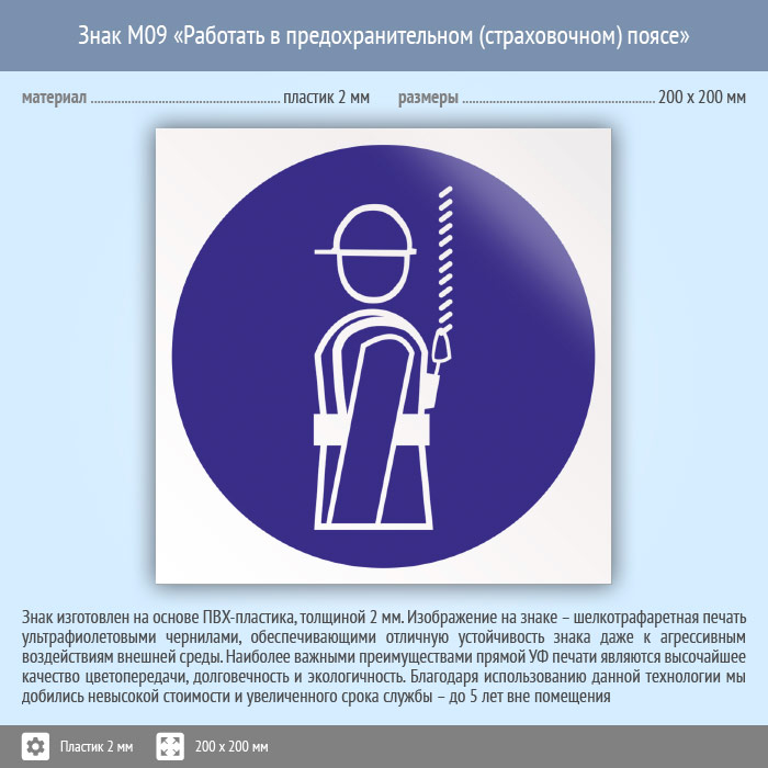 Знак M09 «Работать в предохранительном (страховочном) поясе» (пластик, 200х200 мм) в Яхроме купить