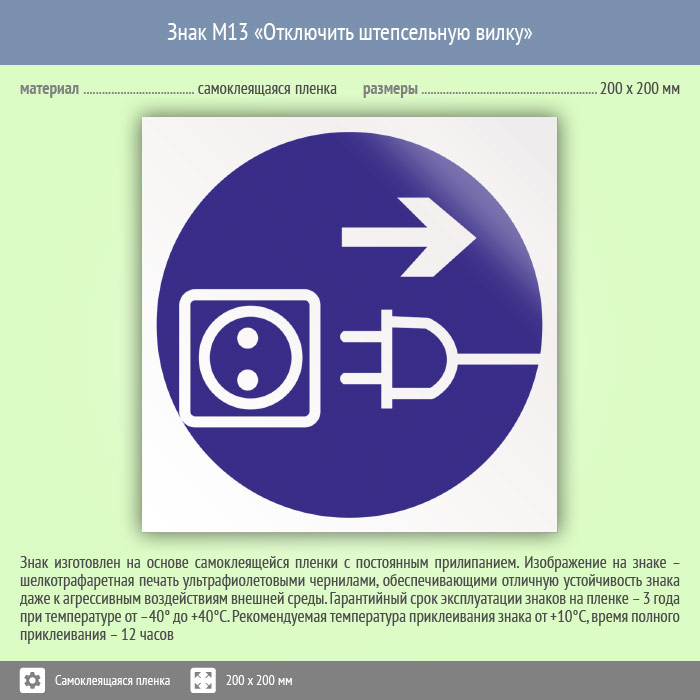 Знак M13 «Отключить штепсельную вилку» (пленка, 200х200 мм) в Яхроме купить