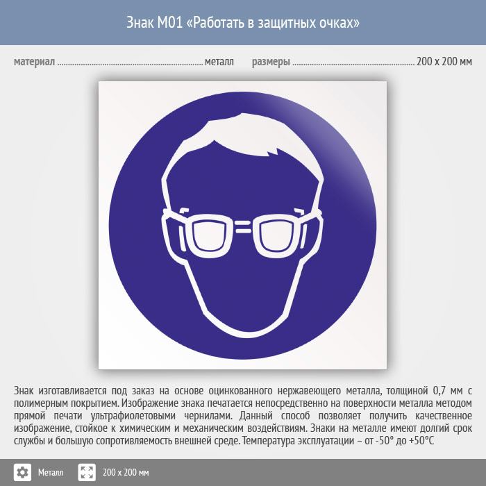Знак M01 «Работать в защитных очках» (металл, 200х200 мм) в Яхроме купить