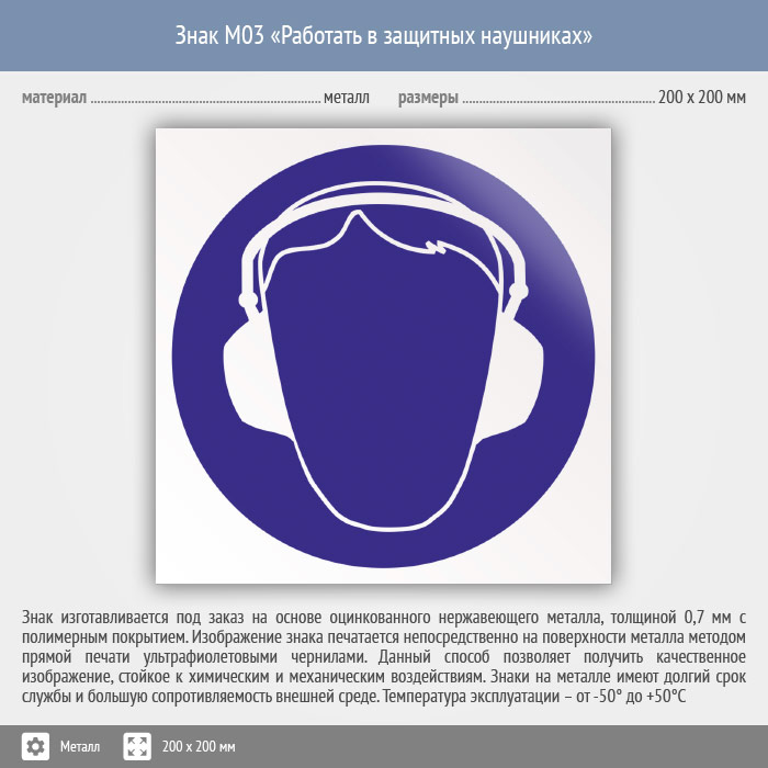 Знак M03 «Работать в защитных наушниках» (металл, 200х200 мм) в Яхроме купить