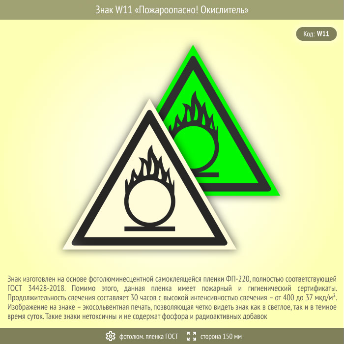 Знак W11 «Пожароопасно! окислитель» (фотолюминесцентная пленка ГОСТ 34428-2018, сторона 150 мм) в Яхроме купить