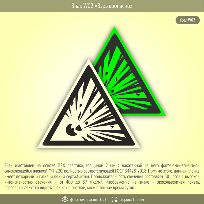 Знак W02 «Взрывоопасно» (фотолюминесцентный пластик ГОСТ 34428-2018, сторона 100 мм) в Яхроме купить