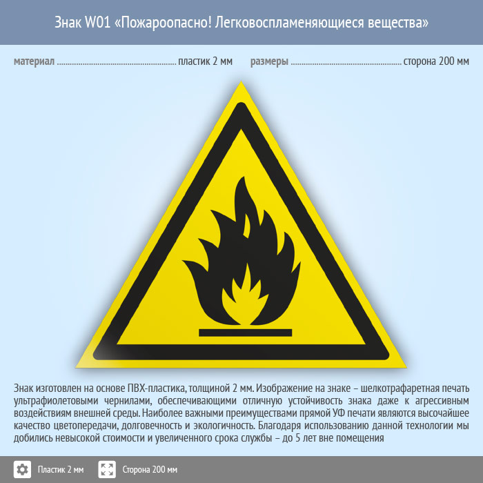 Знак W01 «Пожароопасно! легковоспламеняющиеся вещества» (пластик, сторона 200 мм) в Яхроме купить