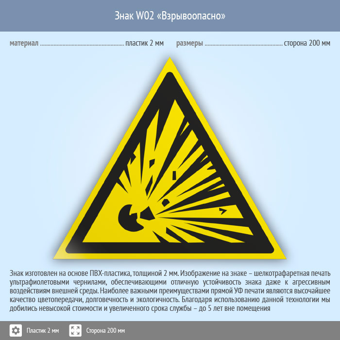 Знак W02 «Взрывоопасно» (пластик, сторона 200 мм) в Яхроме купить