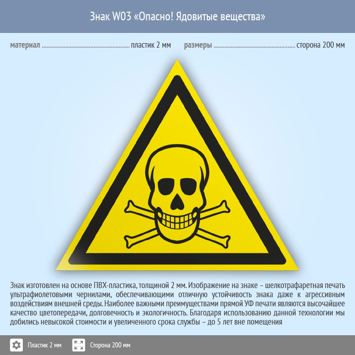 Знак W03 «Опасно! ядовитые вещества» (пластик, сторона 200 мм) в Яхроме купить