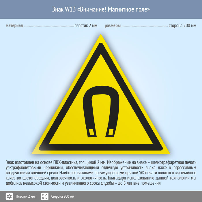 Знак W13 «Внимание! магнитное поле» (пластик, сторона 200 мм) в Яхроме купить