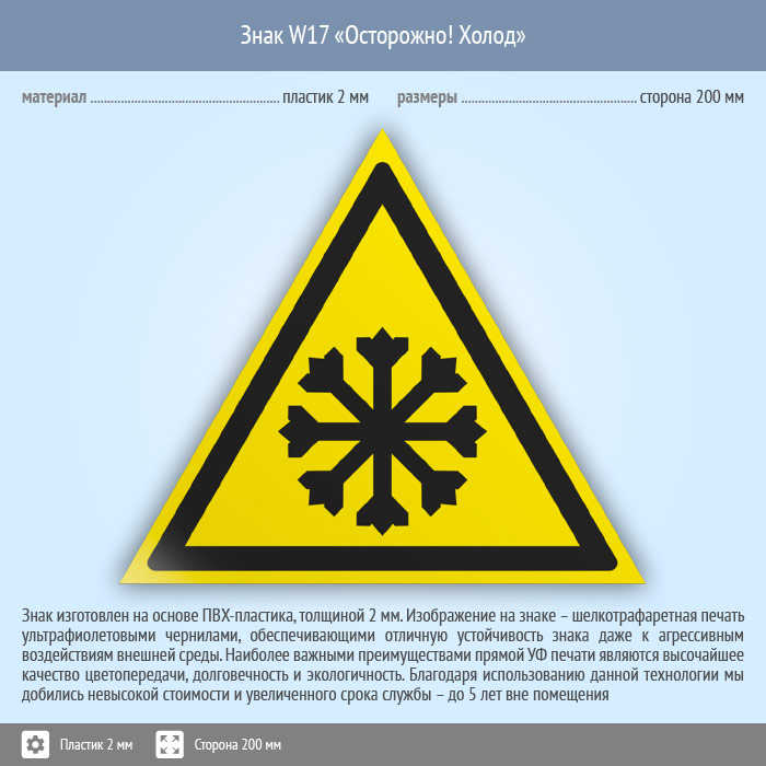 Знак W17 «Осторожно! холод» (пластик, сторона 200 мм) в Яхроме купить