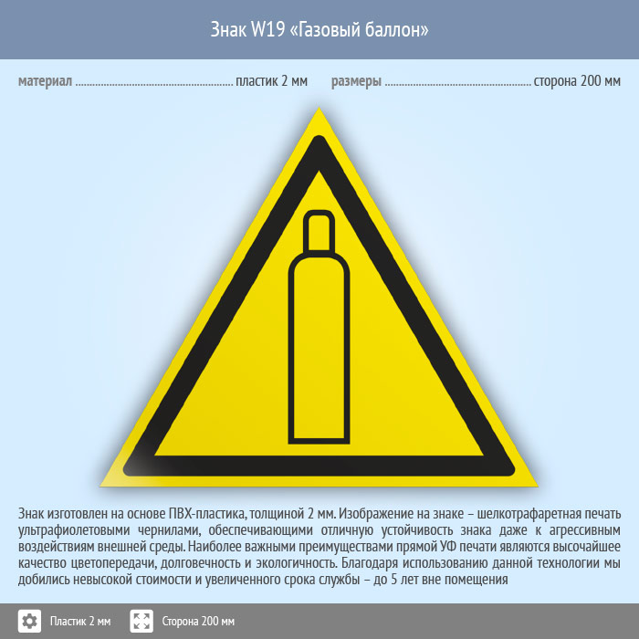 Знак W19 «Газовый баллон» (пластик, сторона 200 мм) в Яхроме купить