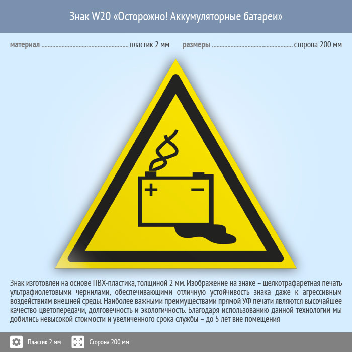 Знак W20 «Осторожно! аккумуляторные батареи» (пластик, сторона 200 мм) в Яхроме купить