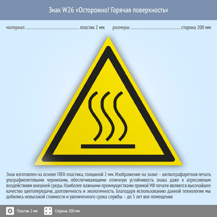 Знак W26 «Осторожно! горячая поверхность» (пластик, сторона 200 мм) в Яхроме купить