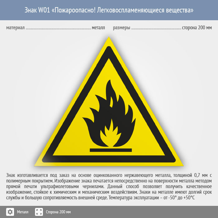 Знак W01 «Пожароопасно! легковоспламеняющиеся вещества» (металл, сторона 200 мм) в Яхроме купить