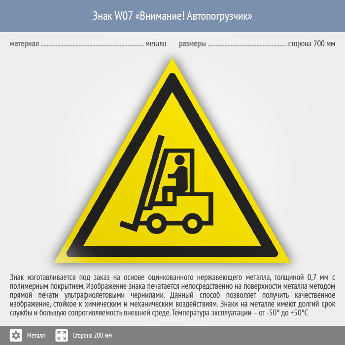 Знак W07 «Внимание! автопогрузчик» (металл, сторона 200 мм) в Яхроме купить