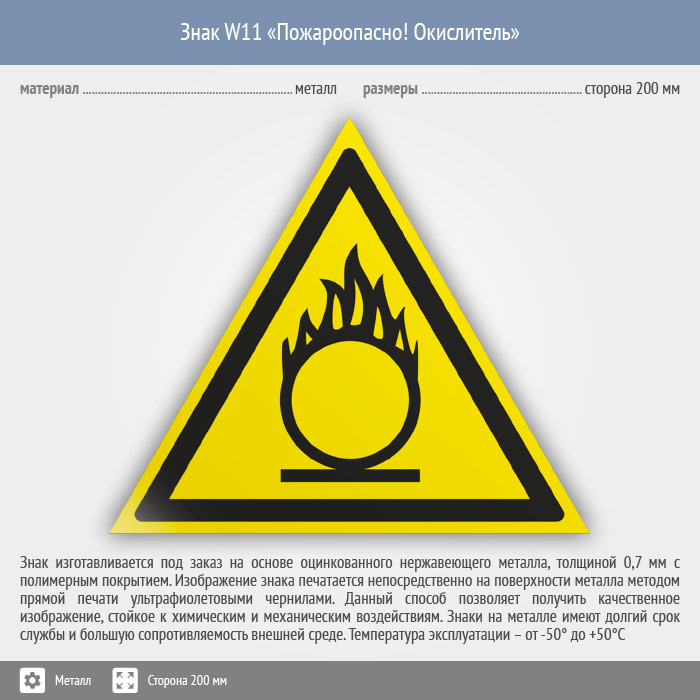 Знак W11 «Пожароопасно! окислитель» (металл, сторона 200 мм) в Яхроме купить