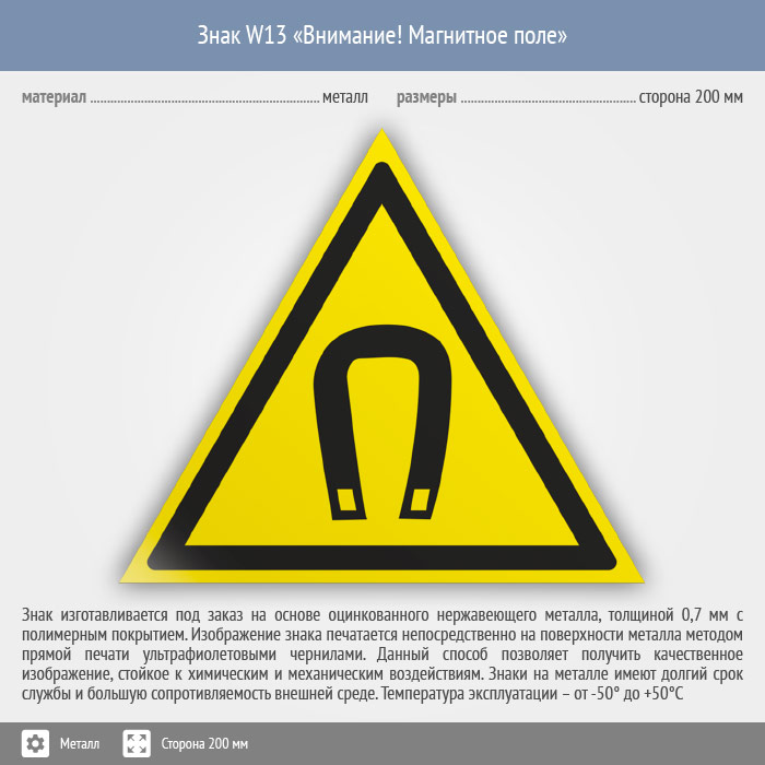 Знак W13 «Внимание! магнитное поле» (металл, сторона 200 мм) в Яхроме купить