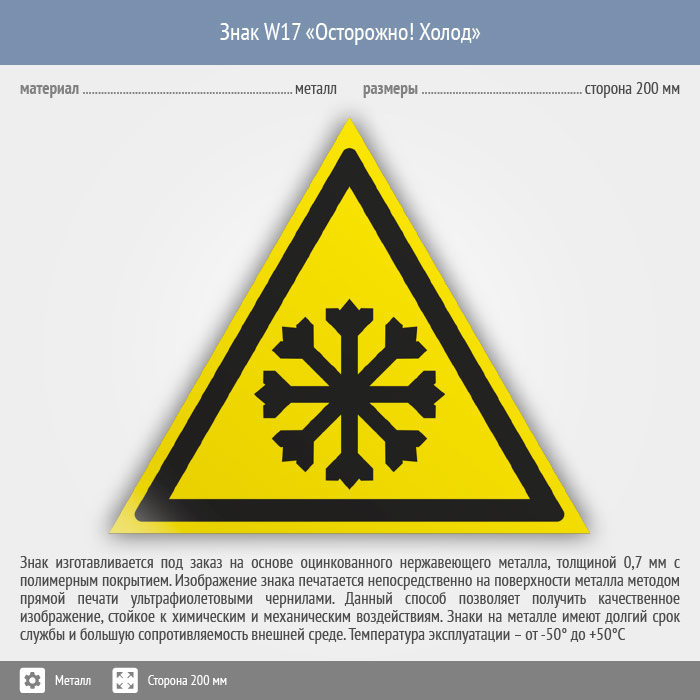 Знак W17 «Осторожно! холод» (металл, сторона 200 мм) в Яхроме купить