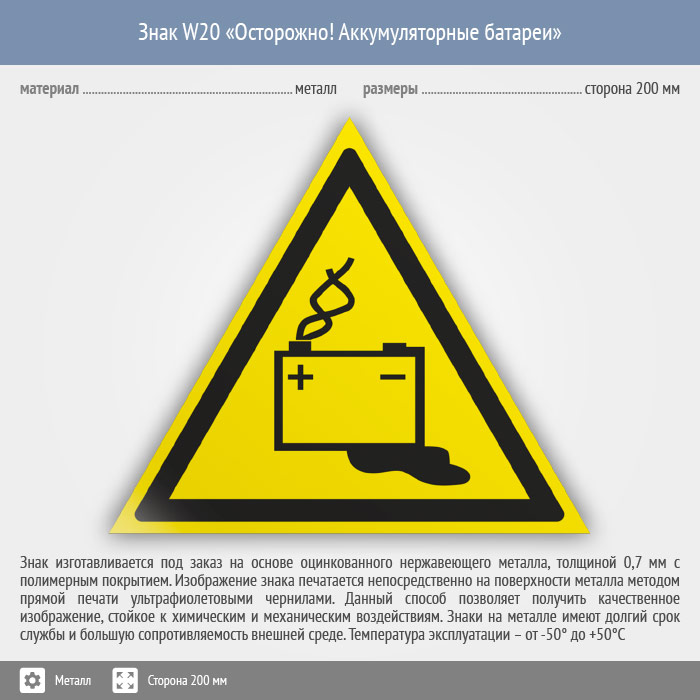 Знак W20 «Осторожно! аккумуляторные батареи» (металл, сторона 200 мм) в Яхроме купить