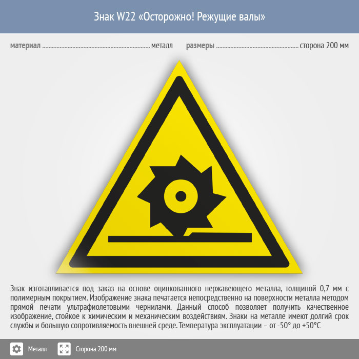 Знак W22 «Осторожно! режущие валы» (металл, сторона 200 мм) в Яхроме купить