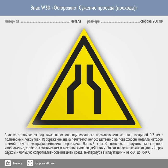 Знак W30 «Осторожно! сужение проезда (прохода)» (металл, сторона 200 мм) в Яхроме купить