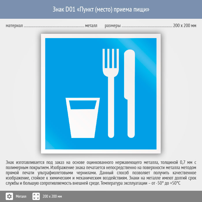 Знак D01 «Пункт (место) приема пищи» (металл, 200х200 мм) в Яхроме купить