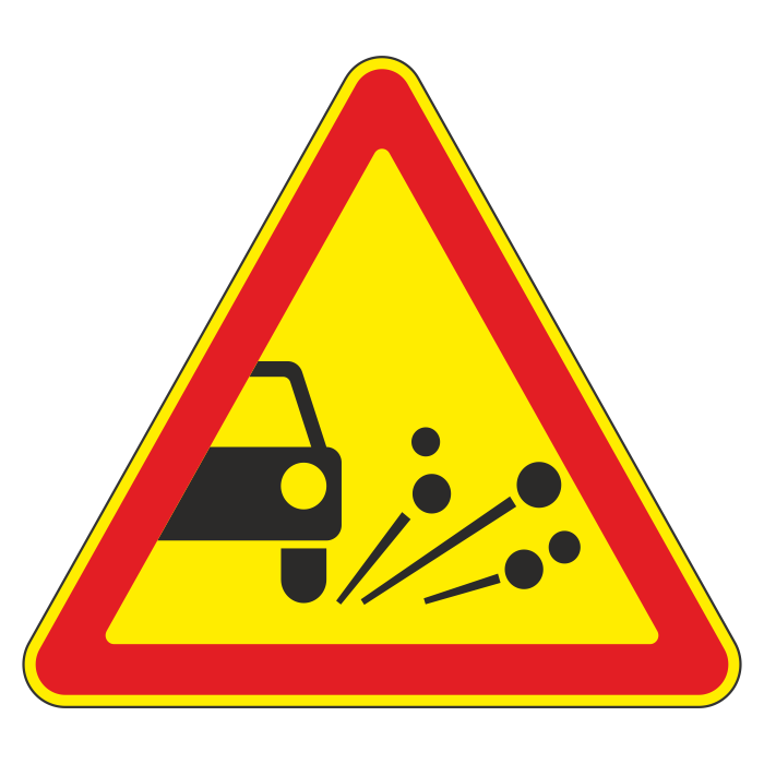 Дорожный знак 1.18 «Выброс гравия» (временный) (металл 0,8 мм, III типоразмер: сторона 1200 мм, С/О пленка: тип Б высокоинтенсивная) в Яхроме купить