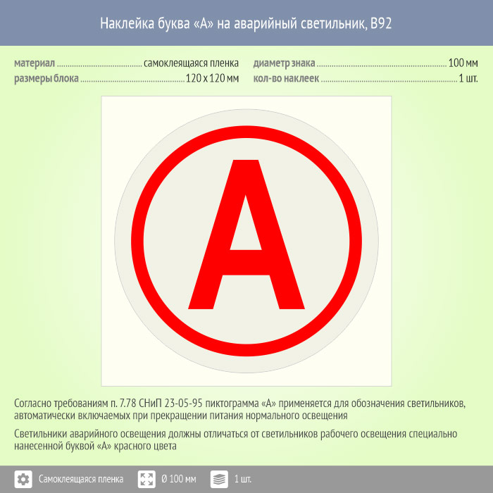 Наклейка буква «А» на аварийный светильник, B92 (пленка, диаметр 100 мм, 120х120 мм) в Яхроме купить
