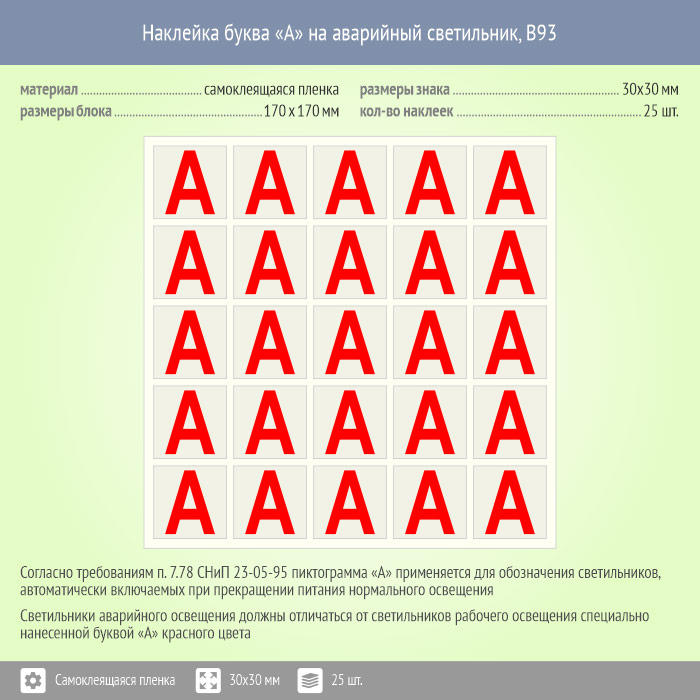 Наклейка буква «А» на аварийный светильник, B93 (пленка, 30х30 мм, блок 25 штук, 170х170 мм) в Яхроме купить