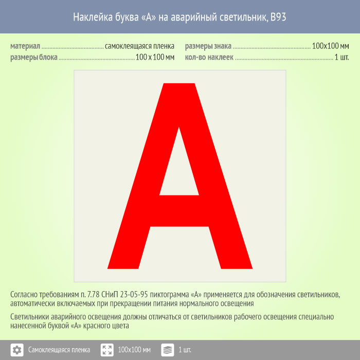 Наклейка буква «А» на аварийный светильник, B93 (пленка, 100х100 мм) в Яхроме купить