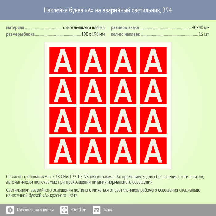 Наклейка буква «А» на аварийный светильник, B94 (пленка, 40х40 мм, блок 16 штук, 190х190 мм) в Яхроме купить