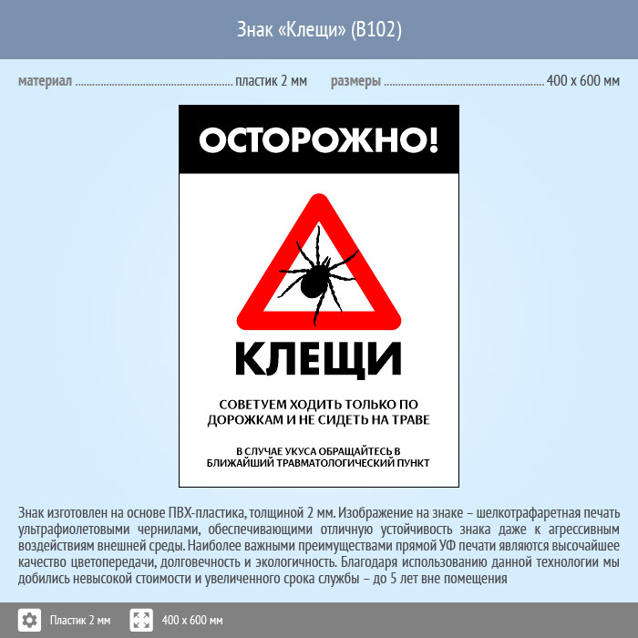 Знак «Осторожно! Клещи», B102 (пластик, 300х400 мм) в Яхроме купить